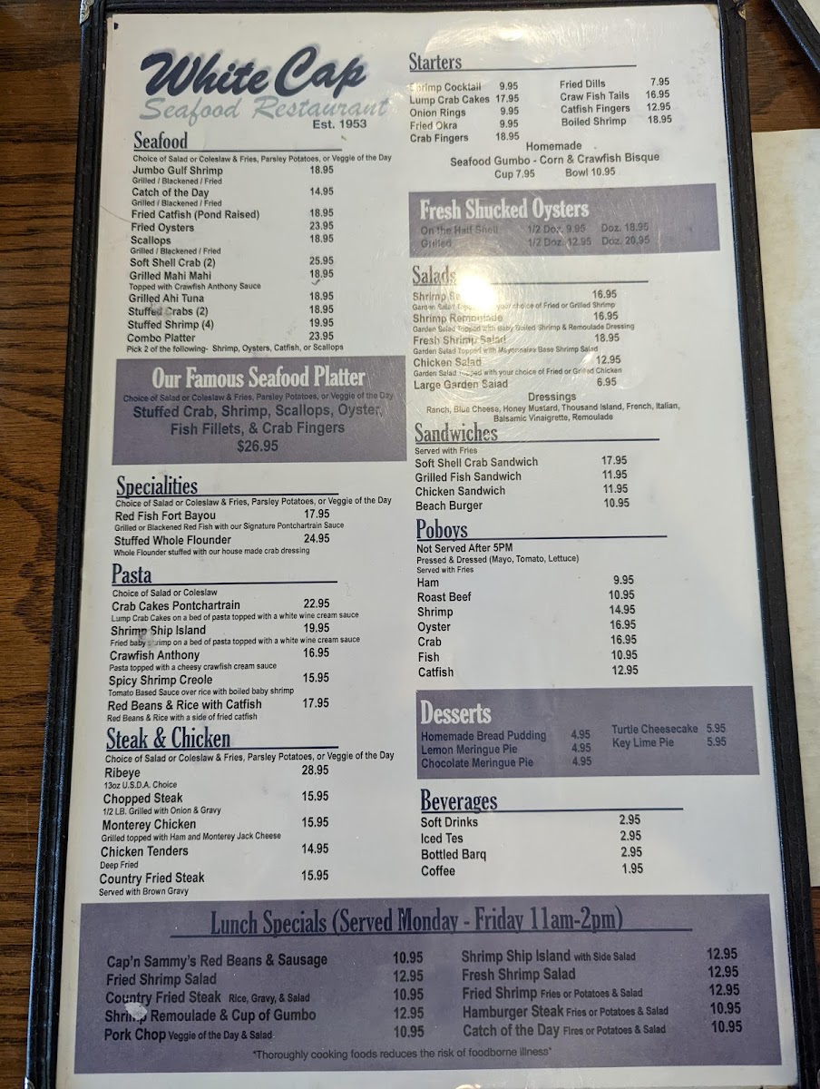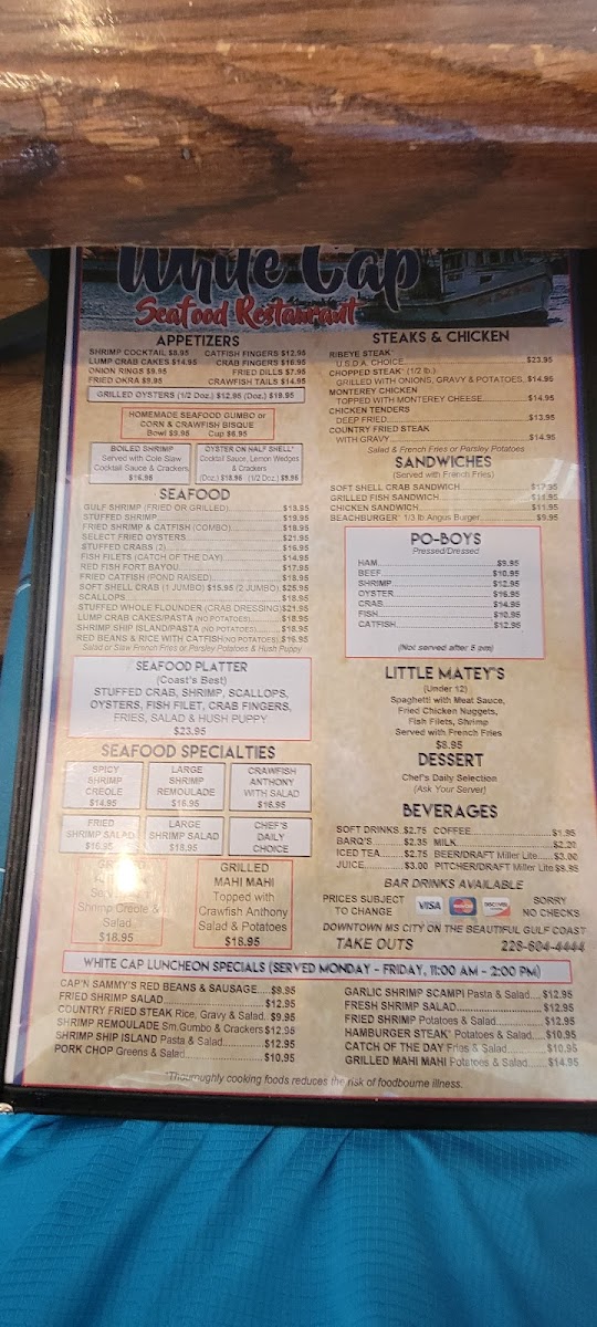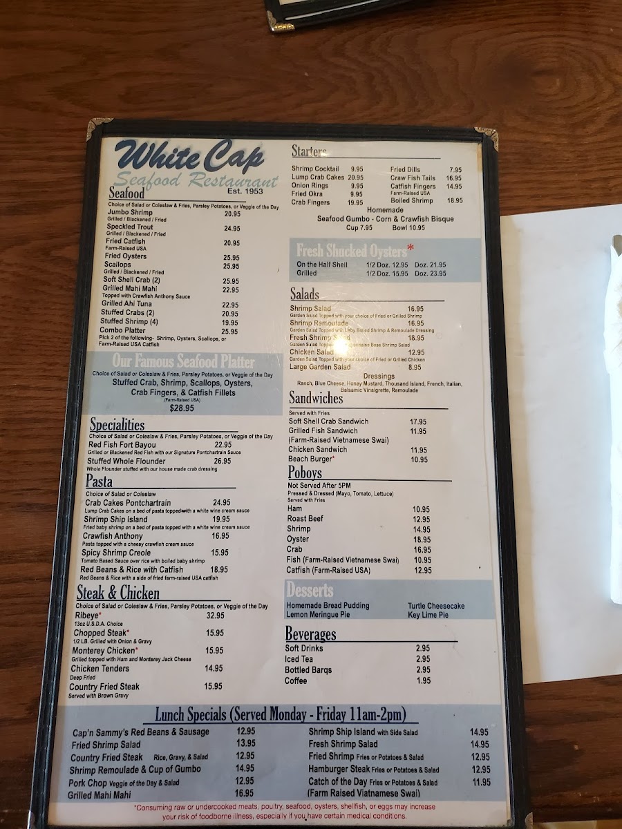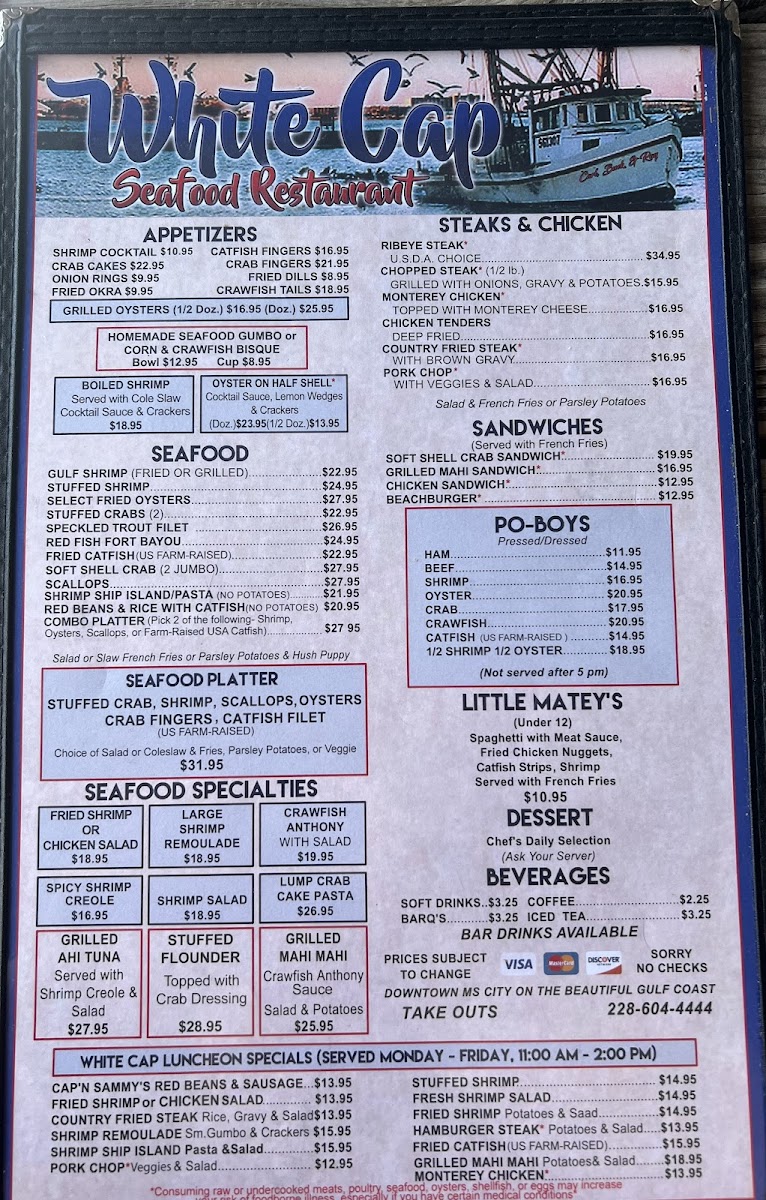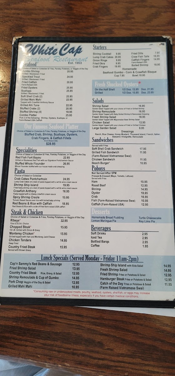 The menu at White Cap Restaurant features a variety of seafood dishes, sandwiches, beverages, and options for younger diners. Seafood offerings include items such as Fresh Fried Seafood Platters, Grilled Mahi Mahi, Blackened Catch of the Day, Crab Stuffed Flounder, Grilled Oysters on the Half Shell, Crab Cakes Pontchartrain, and homemade soups like Corn & Crawfish Bisque and Seafood Gumbo. Side dishes include coleslaw, onion rings, fried dills, and salads.