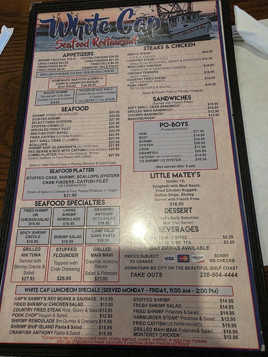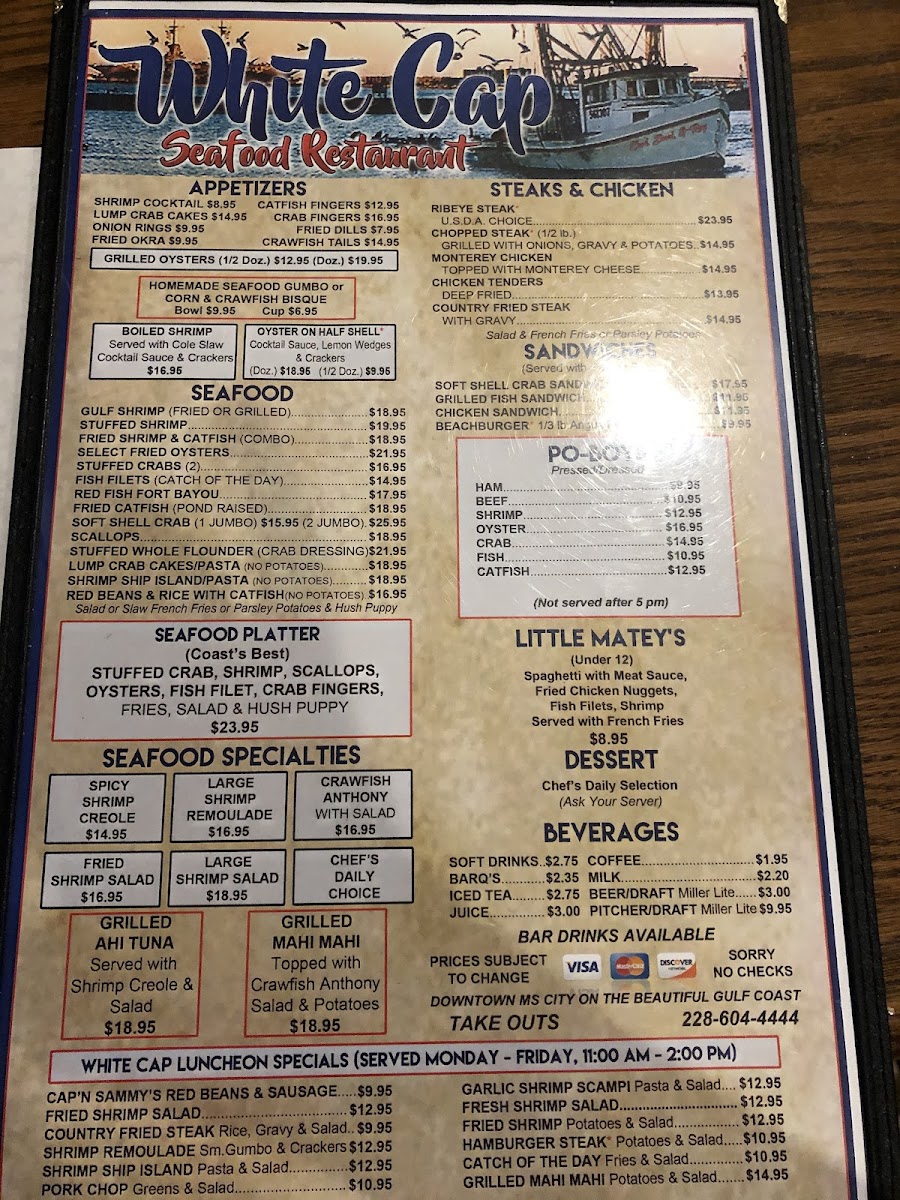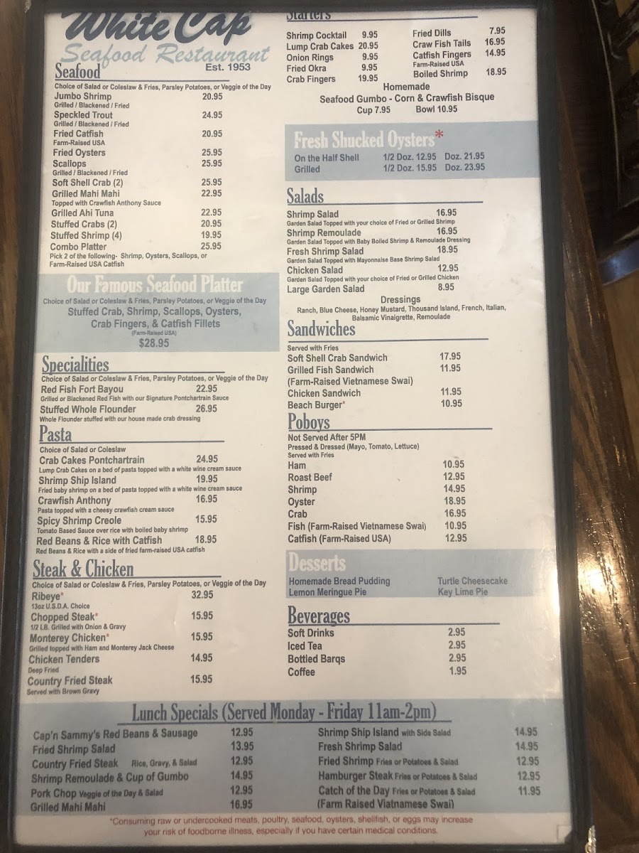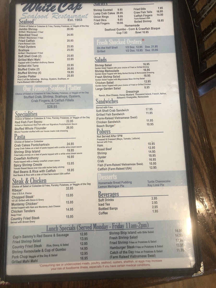The menu at White Cap Restaurant features a variety of seafood dishes, sandwiches, beverages, and options for younger diners. Seafood offerings include items such as Fresh Fried Seafood Platters, Grilled Mahi Mahi, Blackened Catch of the Day, Crab Stuffed Flounder, Grilled Oysters on the Half Shell, Crab Cakes Pontchartrain, and homemade soups like Corn & Crawfish Bisque and Seafood Gumbo. Side dishes include coleslaw, onion rings, fried dills, and salads.